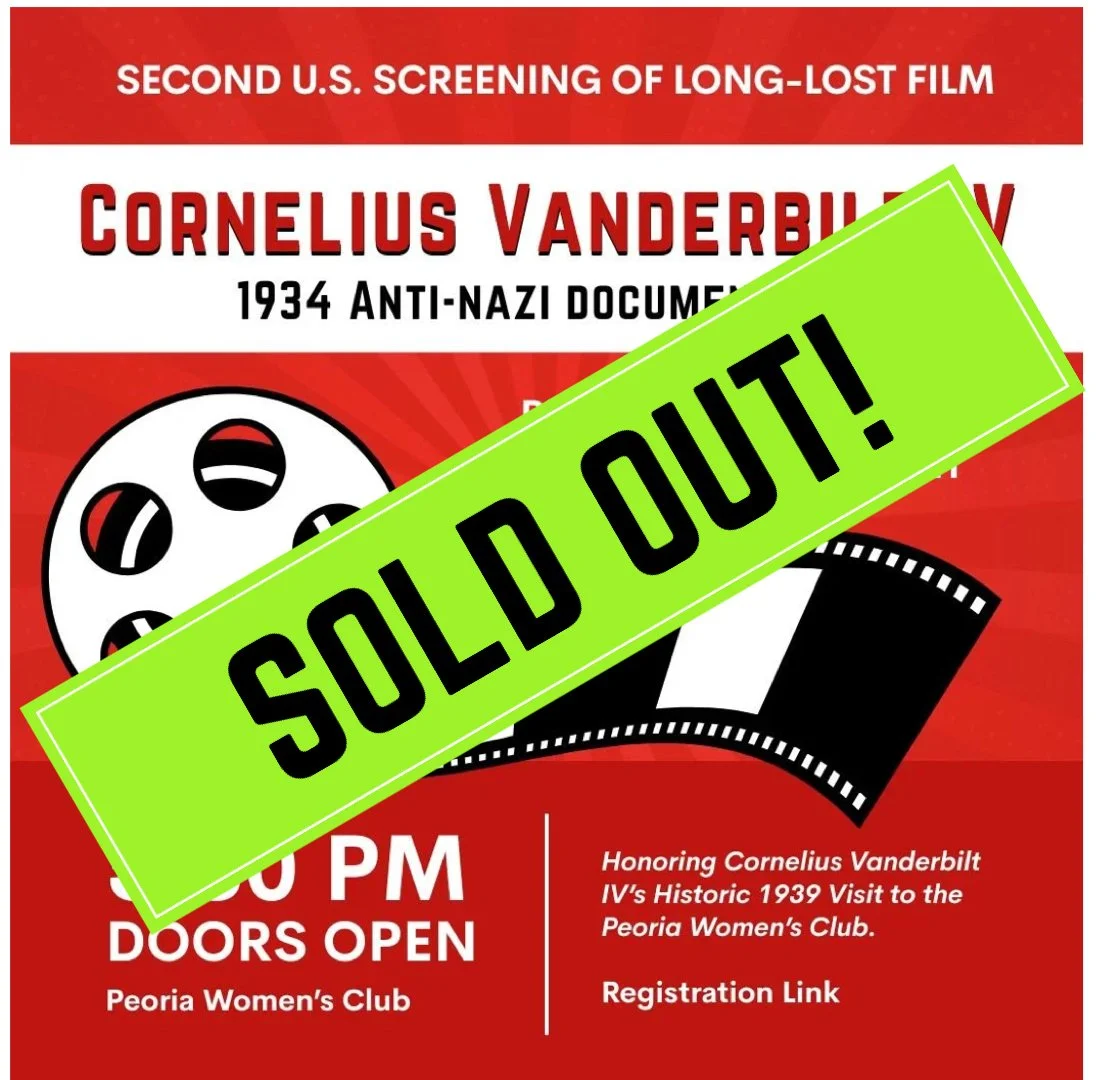 The Peoria Women’s Club, in partnership with the Peoria Area World Affairs Council (PAWAC) at Bradley University, is proud to present a rare screening of Cornelius Vanderbilt Jr.’s 1934 documentary Hitler’s Reign of Terror—one of the earliest American films to warn against Nazi Germany. This event marks only the second U.S. showing since Vanderbilt himself visited the Club in 1939, when he spoke on “Important Interviews on the Eve of War.”